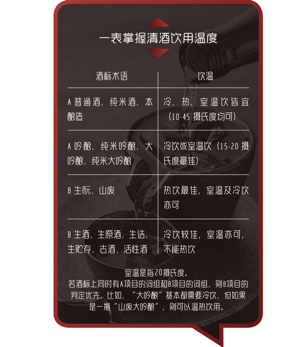 如果你还觉得麻烦不好快速记忆的话,那有个更简单的喝法记忆:冷饮和室温都不会差。但是有些清酒则是加热喝比较好:例如山酛和山废(两种处理酒母的工艺)。上面四个象限中醇酒的最佳温度多位40多度,而爽酒在40度以上也有独特的锐利感。